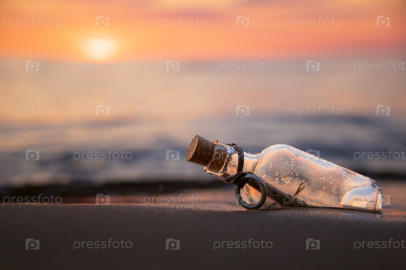 Послание в бутылке на фоне заката Солнца