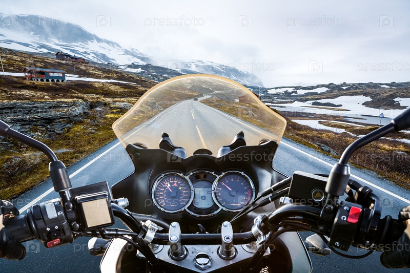 Байкер Вид от первого лица, горный перевал в Норвегии