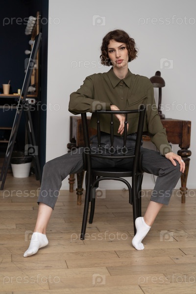 Молодая красивая женщина сидит на стуле в зеленой рубашке в студии