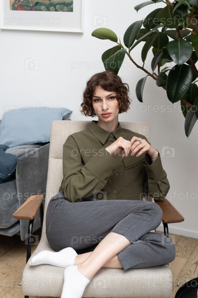 Молодая красивая женщина сидит на стуле в зеленой рубашке в студии