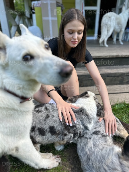 Молодая красивая женщина играет с собакой на улице
