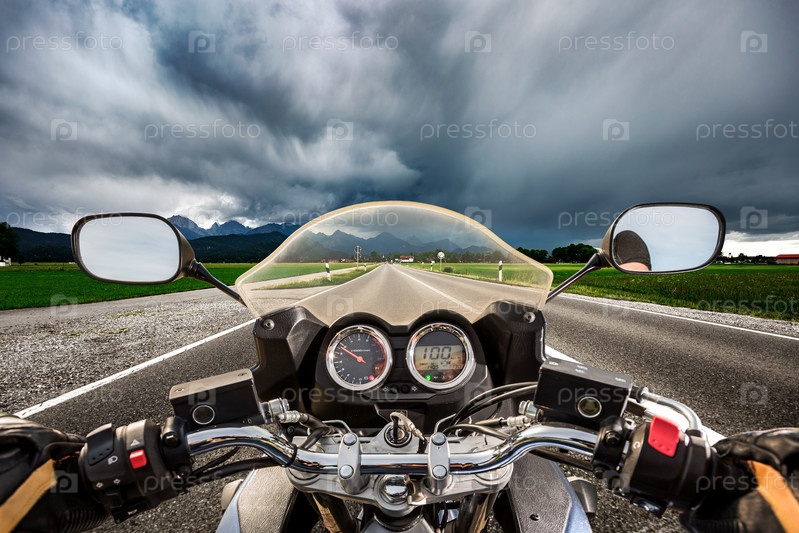 Байкер на мотоцикле мчится по дороге во время грозы - Форгензее и Швангау, Германия, Бавария