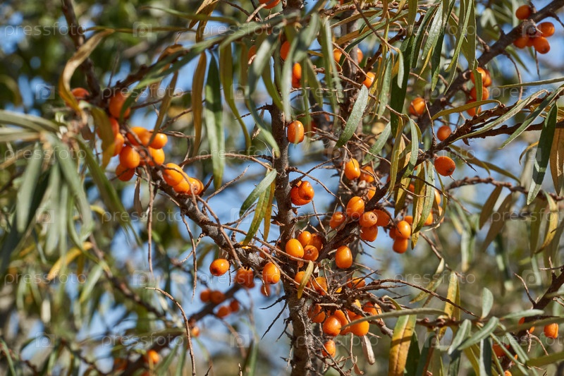 Облепиха созрела на садовом участке. Ягоды облепихи на фоне голубого неба и зеленых листьев