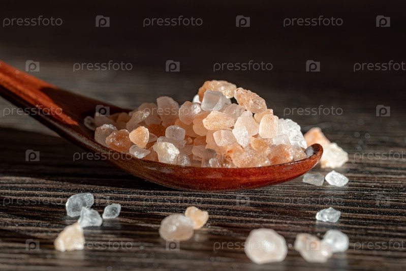 Гималайская розовая соль в деревянной миске используется для ароматизации пищи