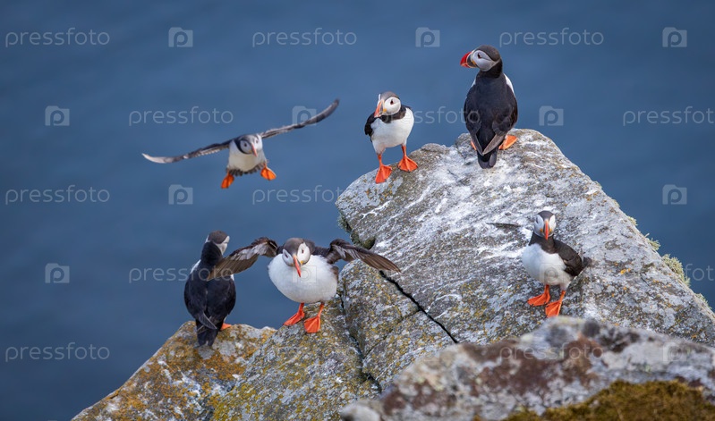 Атлантический тупик (Fratercula arctica) на скале на острове Рунде, Норвегия