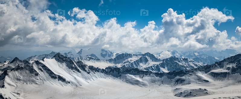 Горные облака над красивыми заснеженными вершинами гор и ледников. Вид на заснеженные горы