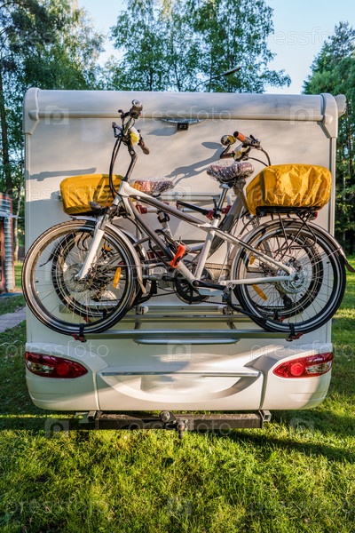 Два велосипеда в караване. Семейный отдых в автодоме, поездка на отдых в автодоме