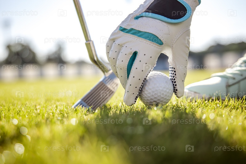 Рука в перчатке кладет мяч для гольфа на ти