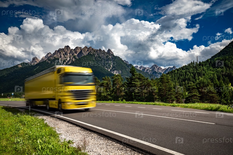 Бензовоз мчится по шоссе на фоне Альп. Грузовик Автомобиль в движении размыт
