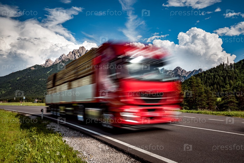 Лесовоз мчится по шоссе на фоне Альп. Грузовик Автомобиль в движении размыт