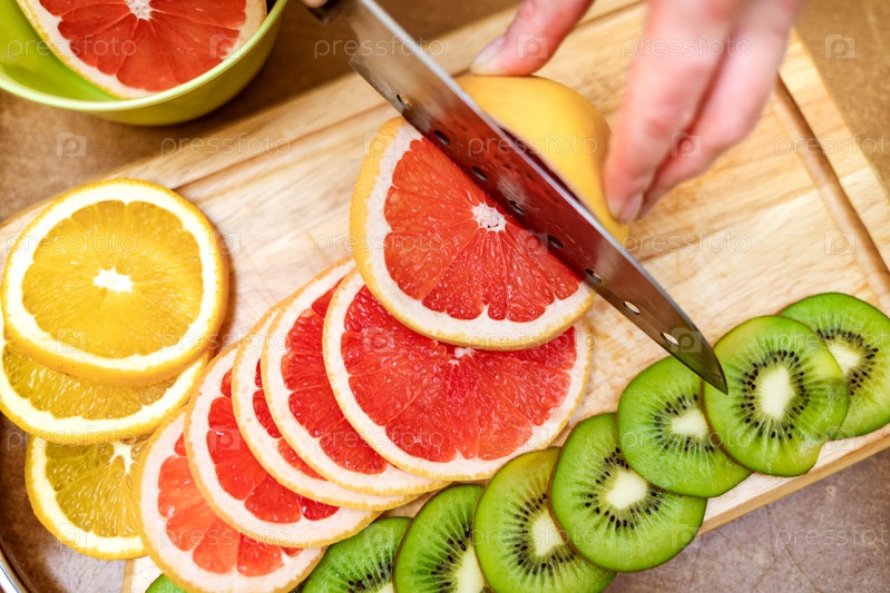 Женские руки хозяйки режут ножом свежий грейпфрут на разделочной доске кухонного стола