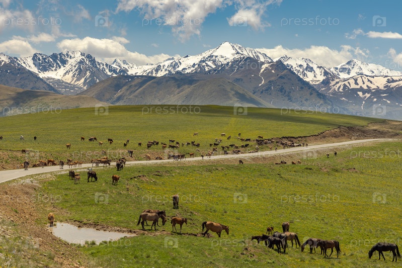 Животные, лошади и коровы пасутся на лугах Приэльбрусья, выходят на дорогу, мешая движению автомобилей