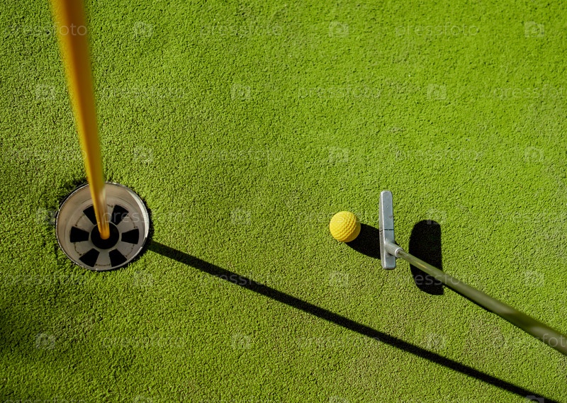 Мини-гольф, желтый мяч с битой возле лунки на закате