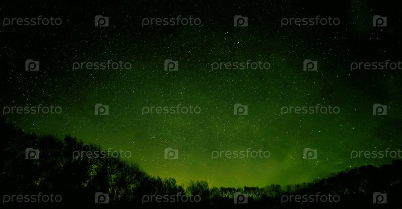 Зеленое звездное небо над темным контуром леса