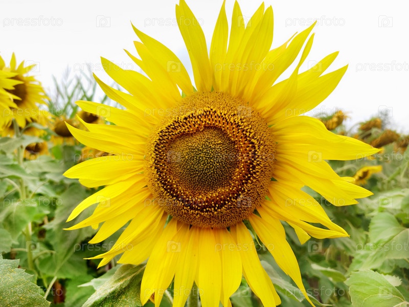На переднем плане в пасмурный день желтый подсолнух