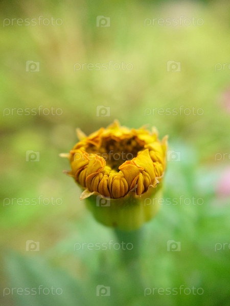 Нераскрывшийся бутон календулы на фоне травы — селективный фокус.Макрофотография.Текстура или фон
