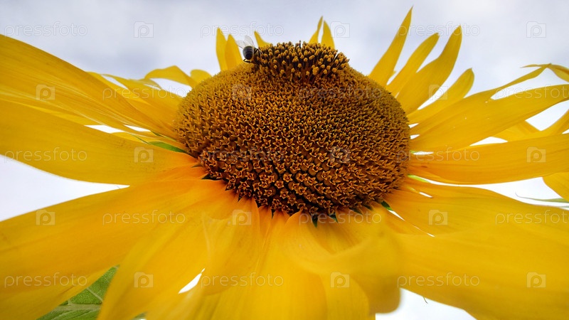 Крупным планом вид снизу на желтый цветущий подсолнух