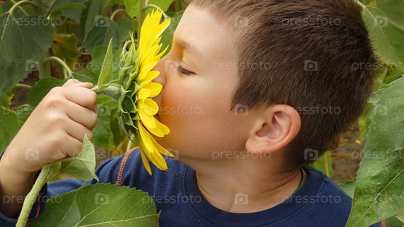 Маленький мальчик нюхает желтый подсолнух летним днем крупным планом