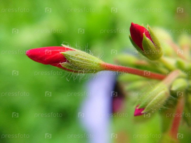 Заостренные нераскрывшиеся бутоны красного цвета на размытом травянистом фоне.Макрофотография.Текстура или фон.Избирательный фокус