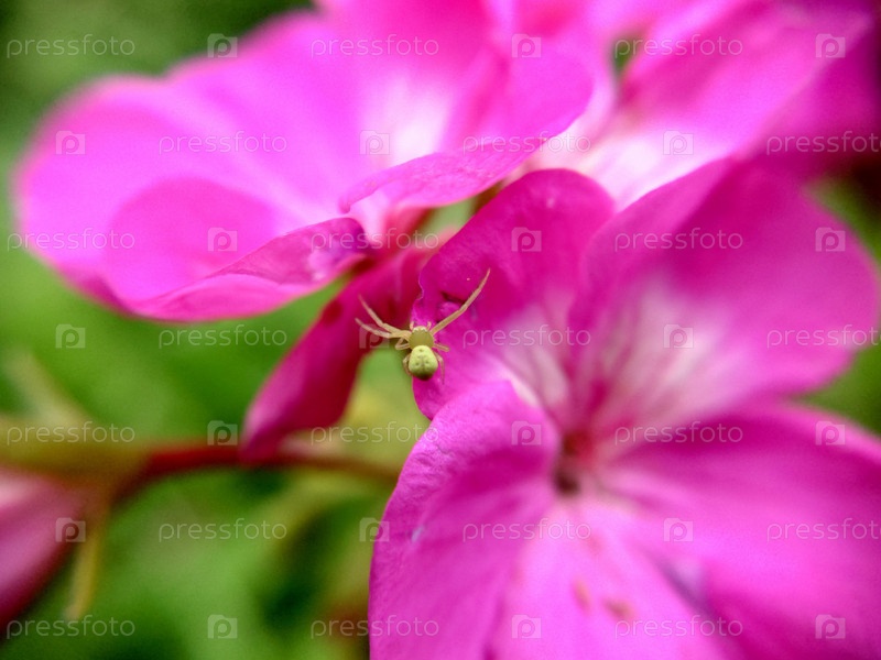 Розовые цветы с зеленым пауком крупным планом