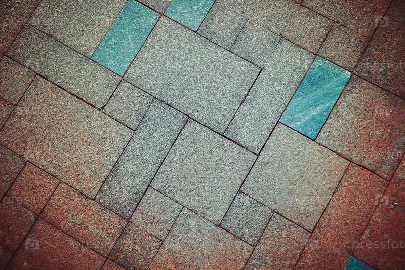 Геометрический рисунок из тротуарной плитки в сине-коричневых тонах, создающий фактурный городской дизайн пола, фоновое изображение