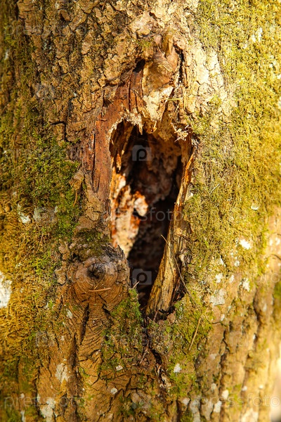 Ствол дерева покрыт зеленым мхом с отверстием в центре