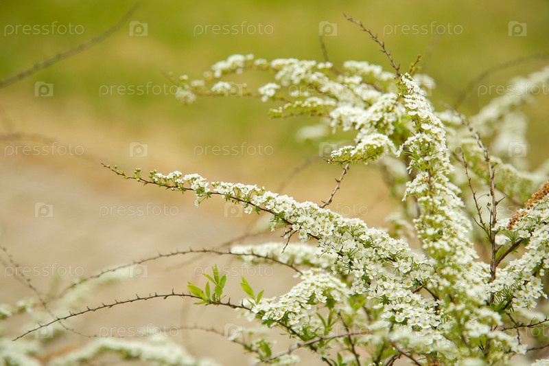 На ветке спиреи расцвело множество мелких цветочков