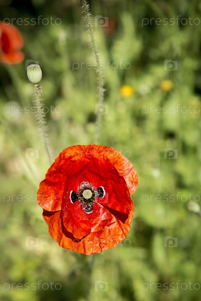 Ярко-красный цветок маки (Pap ver) в полном цветении на зеленом фоне