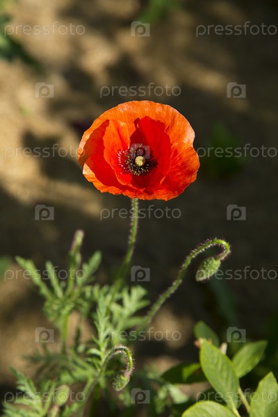 Одинокий красный цветок маки (Pap ver) в солнечном саду на зеленом фоне