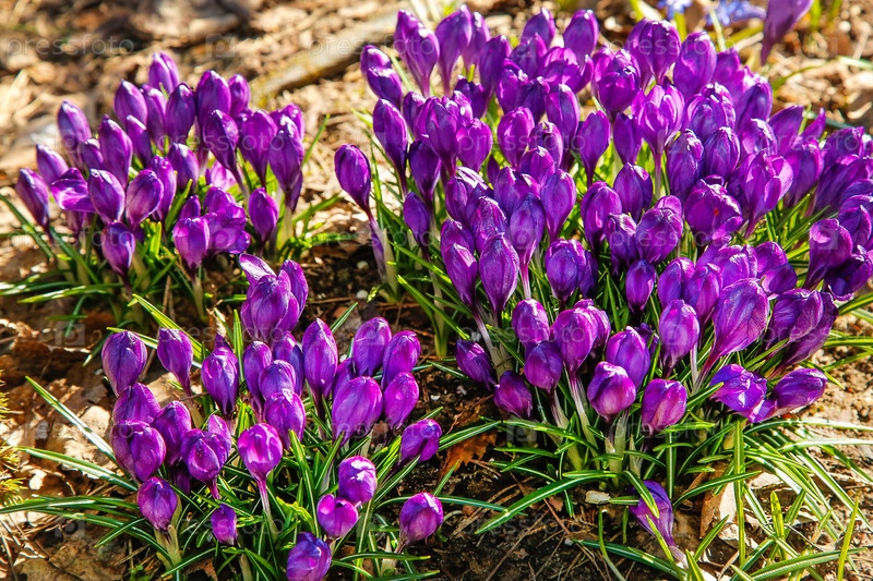 На лесной поляне расцвели первые цветы фиолетового крокуса
