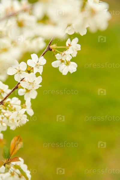 В мае месяце в саду на ветке яблони расцвели маленькие белые цветы крупным планом