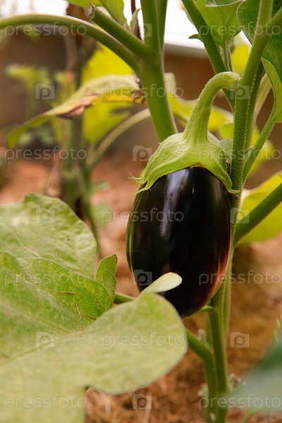 Яркий, темно-фиолетовый баклажан прекрасно созревает на здоровом, цветущем растении в пышном саду