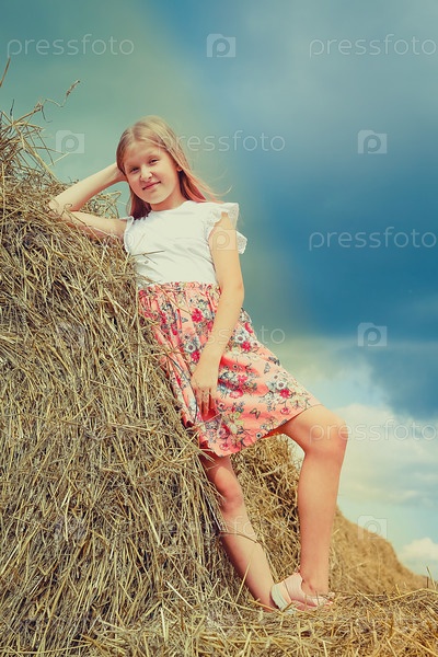 Белокурая девочка с длинными распущенными волосами в розовом платье забралась на большие тюки соломы
