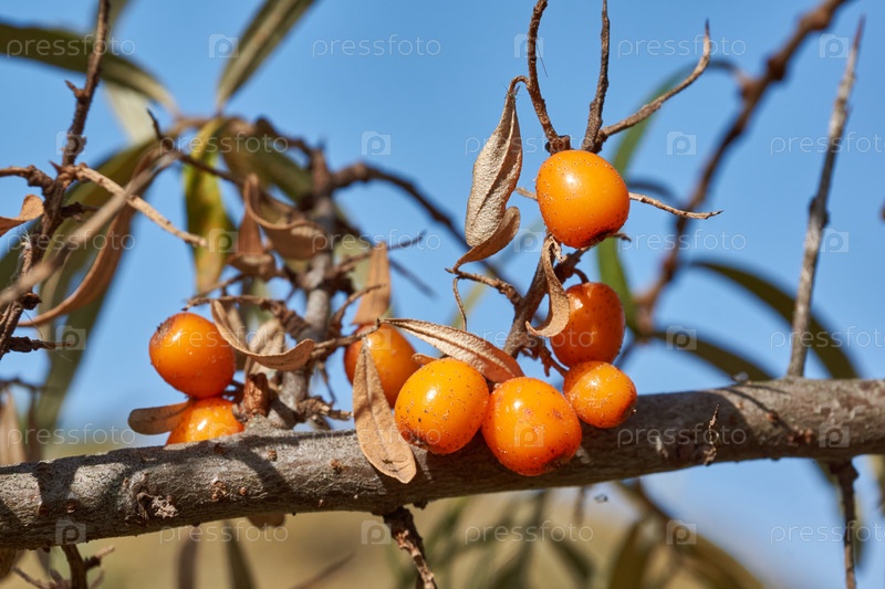 Облепиха созрела на садовом участке. Ягоды облепихи на фоне голубого неба и зеленых листьев