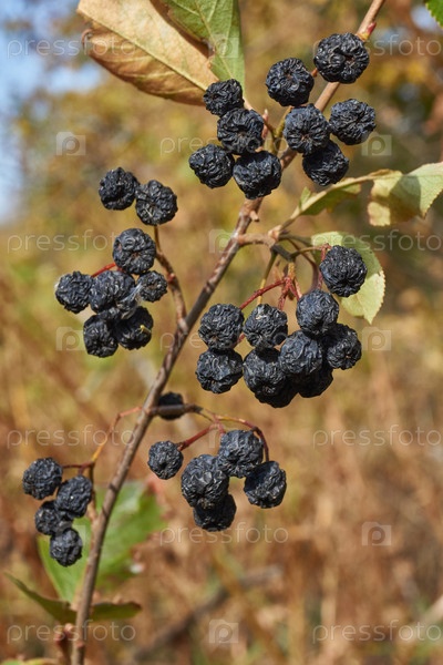 Спелые и увядшие ягоды аронии в саду загородного дома. Осень