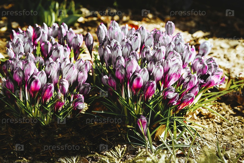 Первые бело-красные цветы крокуса расцвели на лесной поляне ранней весной