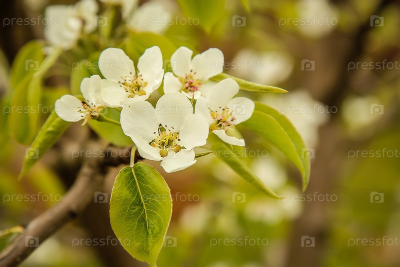 Белые цветы (Malus) в полном цвете на ветке дерева с ярко-зелеными листьями в весенней обстановке