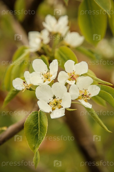 Белые цветы (Malus) распускаются в окружении свежих зеленых листьев, олицетворяя сущность весны
