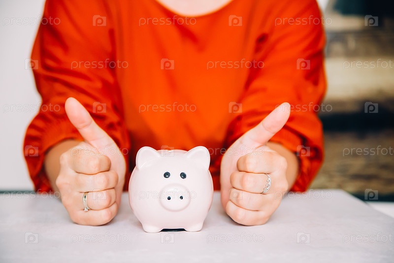 Рука девочки держит большой палец вверх рядом со свиньей-копилкой