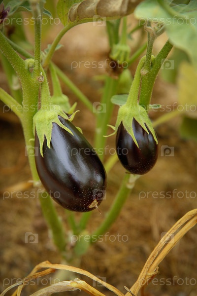 Свежие и вкусные баклажаны, растущие на лозе на открытом воздухе