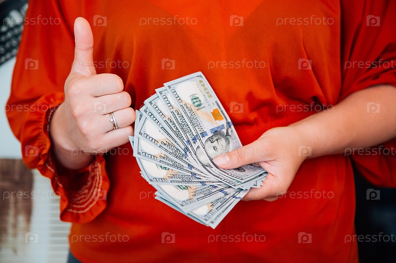 Девушка в красной блузке с гордостью и энтузиазмом демонстрирует деньги, показывая большой палец вверх в знак одобрения