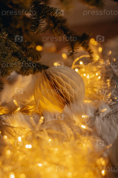 Новогодняя елка с подарками, гирляндой, торшером, игрушками и флажками