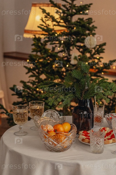 Новогодний стол на фоне елки с гирляндой