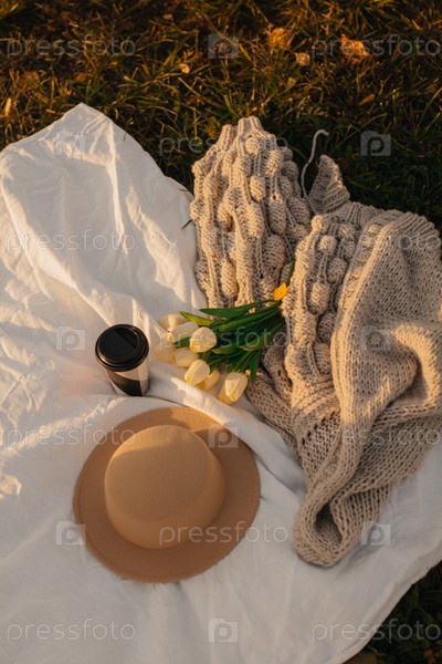 Пикник осенью, букет тюльпанов, кофе, плед и шляпа