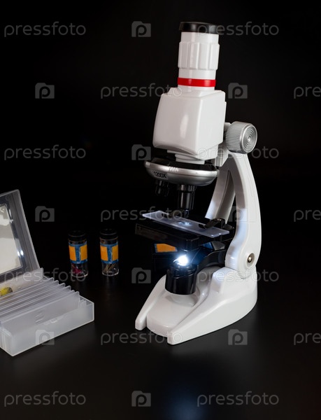 Микроскоп крупным планом на черном фоне стола с лабораторными объектами