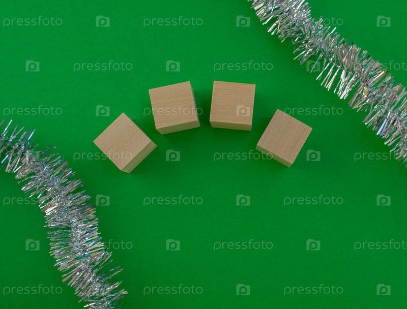 Шаблон новогодней открытки. Деревянные кубики цифры года, мишура на зеленом фоне