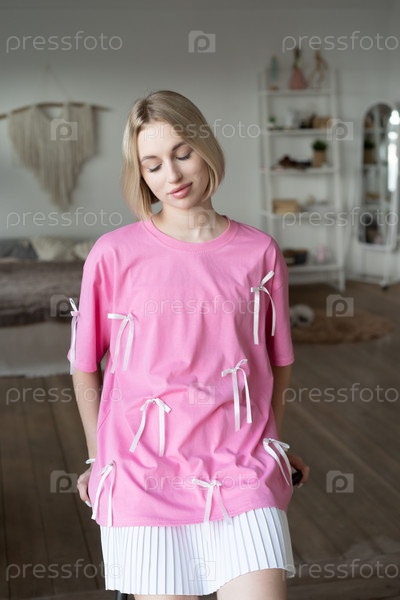 Молодая красивая женщина позирует в розовой футболке в студии