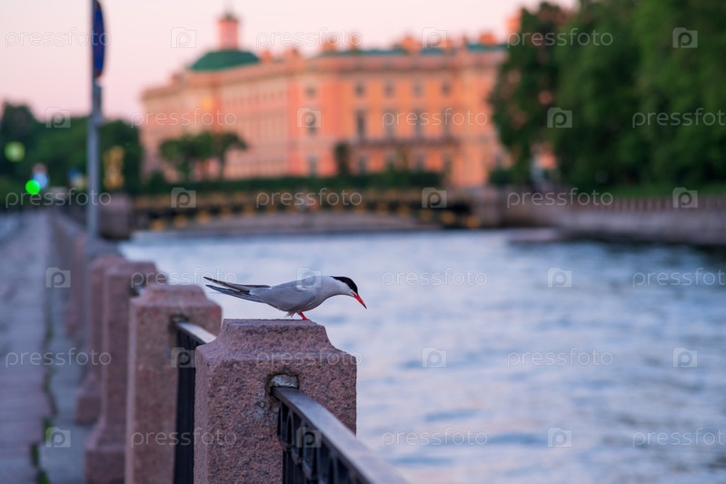Птица обыкновенная крачка на гранитном парапете над водой