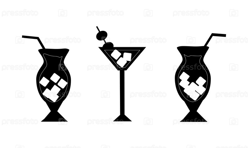 Набор черных силуэтов - летние коктейли в бокалах с кусочками льда