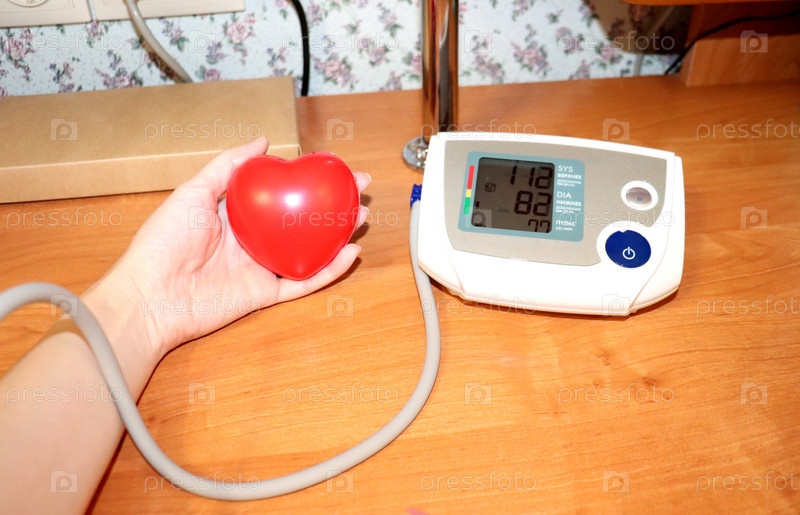 Электронный тонометр и женская рука с ручным тренажером в форме сердца - измерение давления